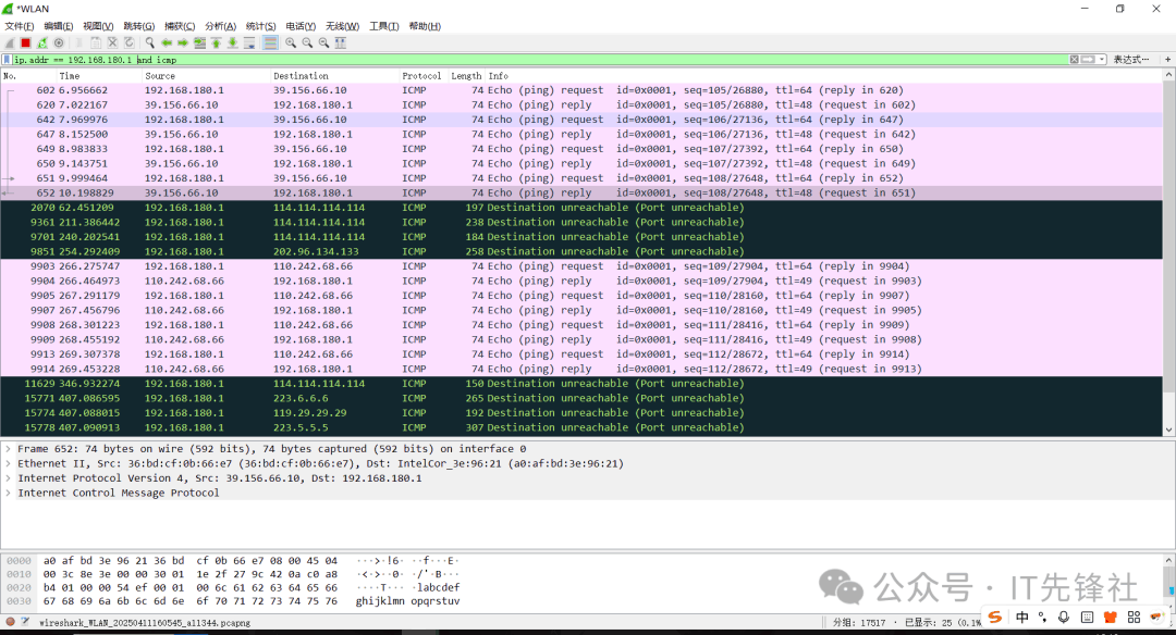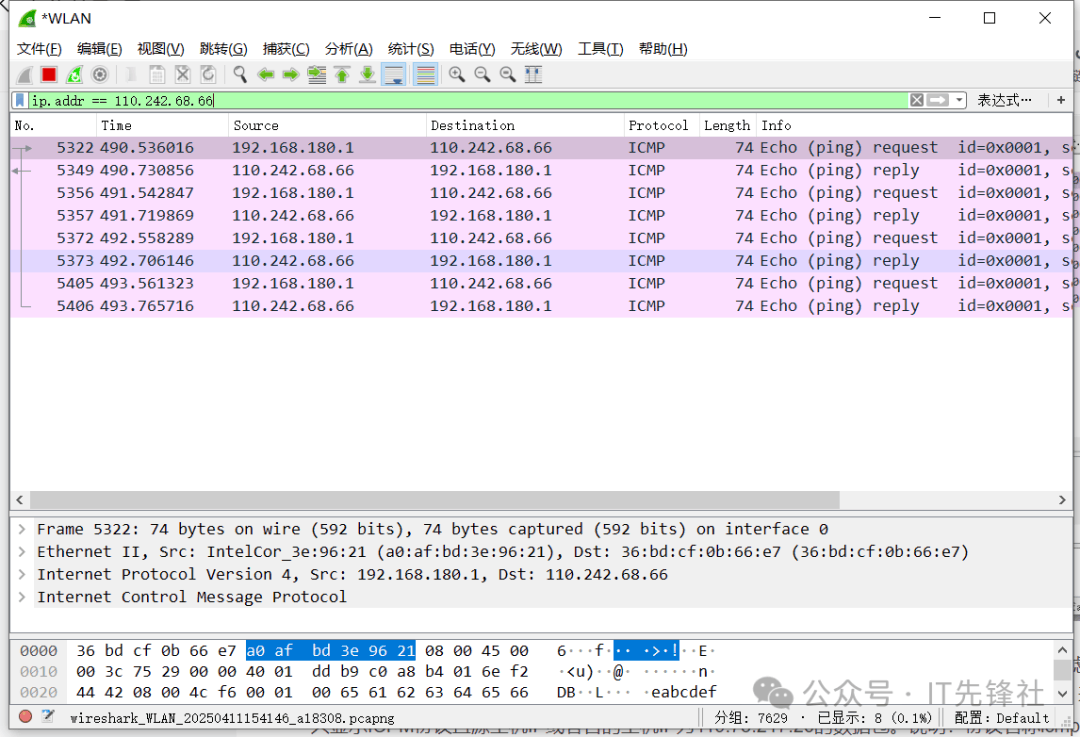 (6)逻辑运算符为 and/or/not 过滤多个条件组合时,使用and/or。比如获取IP地址为192.168.180.1的ICMP数据包表达式为ip.addr == 192.168.180.1 and icmp 逻辑运算符&&与、|| 或、!非