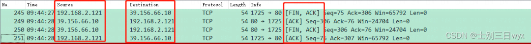 - 3. 第三个包是第三次挥手,百度(39.156.66.10)向我(192.168.2.121)发送一个FIN+ACK,表示这是一个释放连接的请求