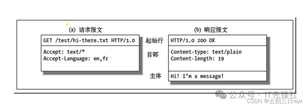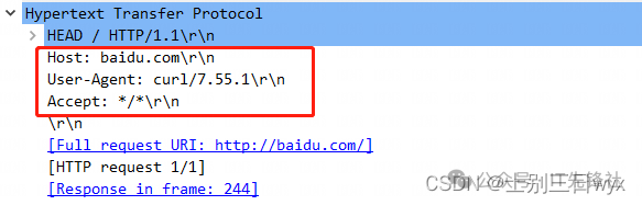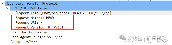响应报文跟我们命令执行的返回结果其实是一样的。因为请求方式是 HEAD,只是获取头部信息,所有这里没有响应体,但能明显看到最后多了一行空格,也就是响应空行。
