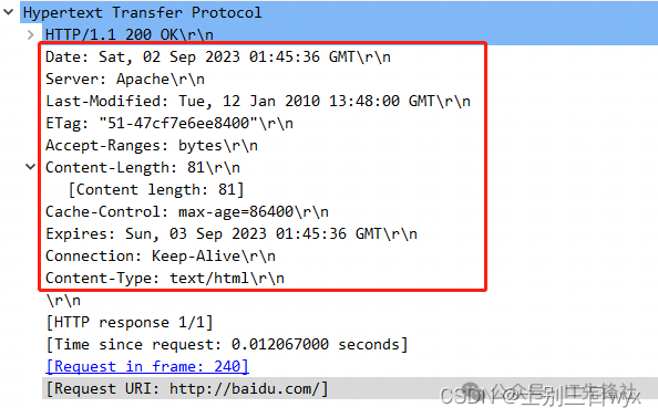2)再看HTTP响应包,找到HyperText Transfer Protocol这一栏,也就是HTTP的报文