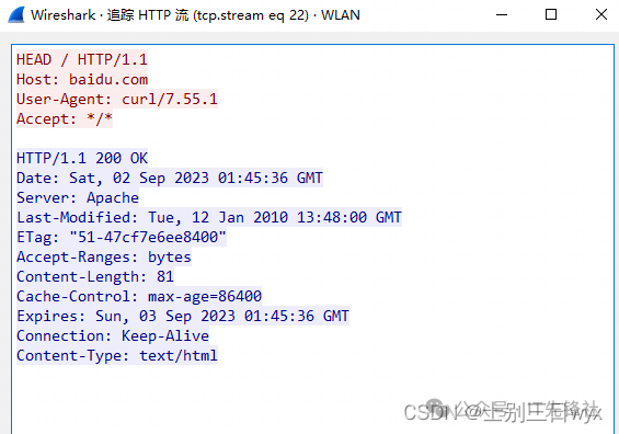 1)打开wireshark开启「抓包」,在cmd中执行 curl -I baidu.com,也就是访问百度,触发HTTP协议。