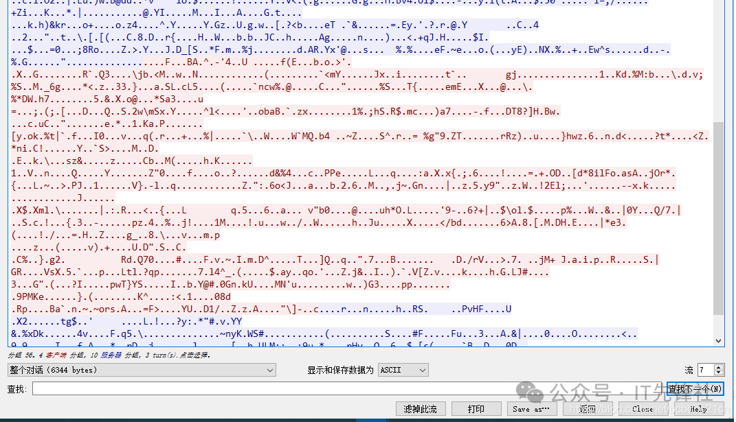 打开捕获文件;在一个协议为TCP的包上右击,选择 追踪流-TCP;将进入TCP流追踪;