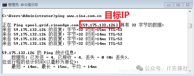结果发现效果不是很好,于是将过滤条件中的IP地址更换为http://www.sina.com.cn的IP地址,操作过程如下: (1)打开命令提示符,通过ping www.sina.com.cn来查看目标IP地址。