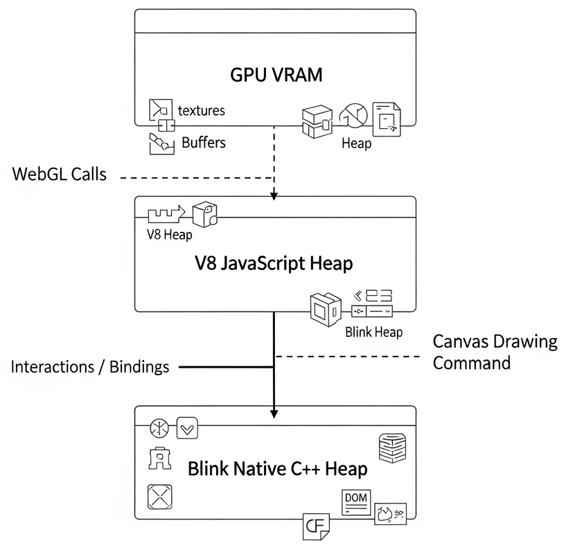 大多数难以诊断和修复的内存泄漏问题,其本质都源于对这三个层面之间的边界、所有权规则以及通信协议缺乏深刻理解。 我们将分别对三个核心部分,系统性地分析每一层内存区域中常见的泄漏模式、底层成因,并介绍实用排查策略和解决方案。通过本篇分享,开发者将能够建立一个贯穿 GPU、JavaScript 引擎和浏览器渲染内核的整体内存心智模型,从而更有效地构建稳定、高效且无泄漏的 WebGL/Canvas 应用。 JavaScript 堆泄漏堆简述 Javascript 的解释器 V8 引擎将浏览器内存分为两个主要部分: