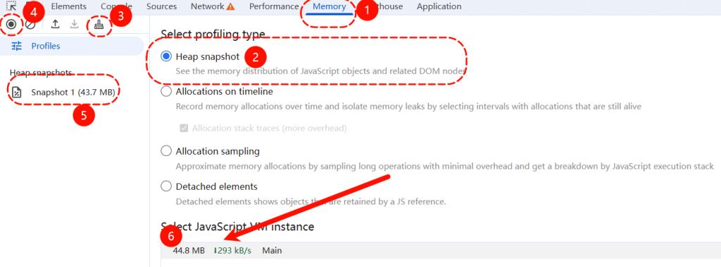 我们重点关注堆上的资源,尽管有自动垃圾回收(GC)机制,JS 堆泄漏仍然是 WebGL 应用中一个常见且棘手的问题。 导致 JS 内存泄漏的常见架构模式: 在 JavaScript 这类具备自动垃圾回收机制的语言中,内存泄漏的本质并非“忘记释放内存”,而是存在“意外的引用”(unwanted reference)。一个在逻辑上已经废弃、应用不再需要的对象,若仍有一条引用链将其与存活的对象图相连,GC 就会判定它“可达”,从而无法回收 。 GC 标记 – 清除(Mark-and-Sweep)算法遵循明确的规则:从根对象开始,逐条追踪所有指针。只要从根到某个对象存在一条路径,该对象就定义为可达,即“存活”。但是 GC 无法理解开发者的语义意图 —— 它无法判断一个已经脱离文档的 DOM 节点是否永远不会被重新挂载,也无法知晓闭包中捕获的变量是否永远不会被访问。它只能机械性地遵循指针。 因此,修复这些内存泄漏并非寻找 V8 引擎的 bug,而是细致地管理对象图,确保当对象在逻辑上不再需要时,通过 myNode = null 或 removeEventListener 等方式显式地切断引用。 以下是一些常见的导致意外引用的模式: 1、 分离的 DOM 元素 分离的 DOM 元素 (Detached DOM Elements) 这是最经典的泄漏模式之一。当一个 DOM 节点通过 element.removeChild() 从文档树中移除后,它在页面上就不再可见。但是,如果此时 JavaScript 代码中仍有某个变量持有对该节点的引用,那么这个节点及其整个子树都无法被 GC 回收。在复杂的单页应用(SPA)中,视图组件被动态创建和销毁,如果销毁逻辑不完善,很容易留下对旧视图 DOM 节点的引用。 2、闭包引起的意外作用域捕获 闭包(Closure)是 JavaScript 的一个强大特性,它允许函数访问并操作其词法作用域(lexical scope)中的变量,即使该函数已在其作用域之外被调用。但是这份强大也暗藏风险,闭包往往是内存泄漏的“隐形源头”。 闭包会完整持有其创建时所在作用域的引用。若一个生命周期很长的内部函数(例如,一个事件回调或定时器回调)是在一个包含大型对象引用的外部函数中创建的,那么这个大型对象也会被闭包“捕获”。即使内部函数本身从未使用过它,大型对象也会始终处于可达状态,最终导致垃圾回收器无法对其回收,从而造成内存泄漏。 3、 悬空的定时器和事件监听器 传递给 setInterval、setTimeout 或 element.addEventListener 的回调函数,其生命周期会持续到定时器被清除或事件监听器被移除为止。在此期间,若回调函数内部引用了其他对象(比如某个组件的实例或数据),这些被引用的对象也会被“绑定”而保持存活状态。在组件化开发中,最常见的疏漏之一便是:在组件销毁时忘记清理这些定时器与事件监听器。这就会直接导致整个组件实例及其依赖对象始终处于可达状态,最终无法被回收,从而造成内存泄漏。 4、意外的全局变量 在非严格模式下,函数内给未声明的变量进行赋值,JavaScript 不会报错,反而会在全局对象(如浏览器的 window)上创建一个同名变量。全局变量作为 GC 根节点,它们在应用的整个生命周期内都无法被回收。这种“意外的全局变量”通常由拼写错误或忘记使用 let、const、var 关键字引起,是一种隐蔽但危害严重的内存泄漏源。 Chrome DevTools 堆分析实战指南 Chrome DevTools(开发者工具) 的 Memory(内存)面板是诊断 JS 堆泄漏的权威工具。它可以对当前堆进行快照,直观的展示当前的占用情况。 具体操作位置在 Chrome DevTools -> Momery 标签页(图中 ①)。 1.在内存分析中,Heap snapshot(堆快照)是最常用的排查手段,在生成快照前,需先选择这一类型(图中 ②)。 2.在生成快照前,需要先点击上图中的 ③ 号按钮(强制垃圾回收),待完成一次 GC 后,再点 ④ 号按钮生成快照。这样做的原因是,我们的核心目标是排查内存泄漏问题,强制 GC 能释放原本应该被回收的资源,这会让快照结果更加直观地显示出问题。 3.快照生成后,在 ⑤ 位置会显示快照信息,展开后如下: (⑥ 位置会展示堆内存的大小,能快速且直观地了解到整个页面的堆内存占用情况。) 在快照信息中,需要重点关注每个对象的两项核心数据: