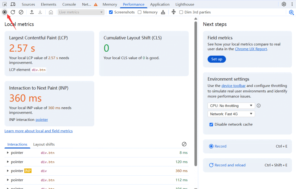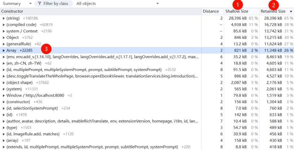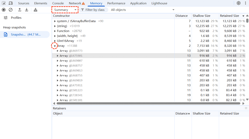 在实际分析中,建议优先关注 Retained Size,因其能更全面地反映对象堆内存占用的实际影响。 快照的摘要视图 在上图所示的摘要中,每一项都支持展开,展开后可以看到对象的完整引用链。摘要面板适合的运用场景:当单次 Profile 已显示出大量的内存占用时,可先按 Retained Size 对列表进行排序,快速定位到占据了过高的内存的项,展开其中的可疑目标并一路追溯,直到找到根源 —— 通常是挂载到全局 windows 对象上的变量,或被闭包捕获的变量。 三快照法(推荐的排查步骤) 在多数情况下,泄露是缓慢发生的,单个堆快照包含了数百万个对象,杂乱无章,不方便直接找到泄漏源。因此,我们更推荐使用“三快照法”来找到泄露的源头。具体操作步骤: