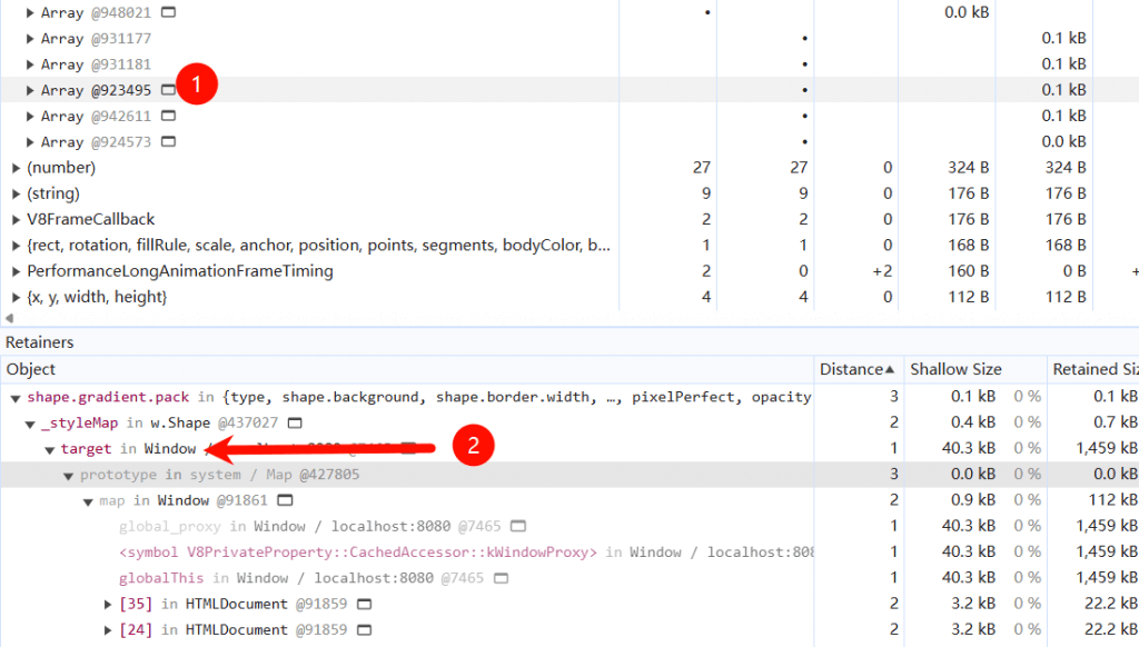 该视图的意图是:查找出快照 2 较快照 1 新增的内存对象,若这些新增对象在快照 3 中依然存在,那么它们极有可能是泄露的源头。 3、使用 Retainers 树追溯泄漏源 在对比视图中定位到一个可疑的泄漏对象(即对应的构造函数)后,展开该构造函数,并选中其中一个实例。此时,下方的 Retainers(保留者)面板会自动加载内容。这个面板是定位内存泄漏根源的核心工具,面板展示了一条或多条引用链,并清晰地解释了被选中对象无法被 GC 回收的原因。 具体分析步骤如下: