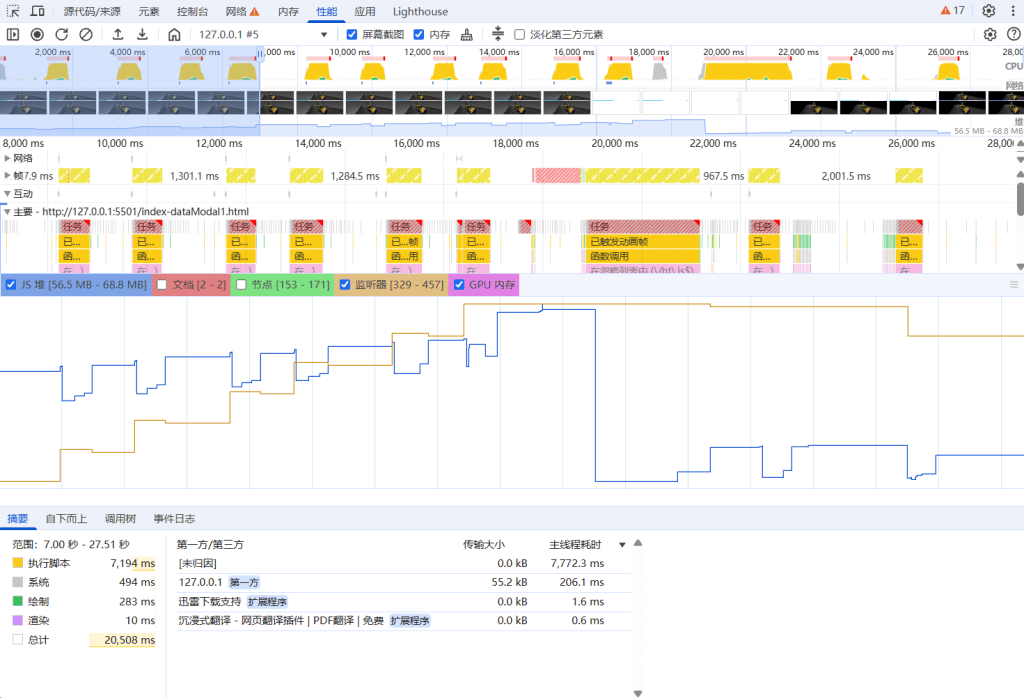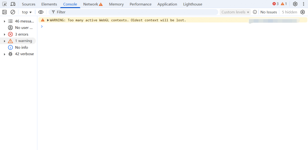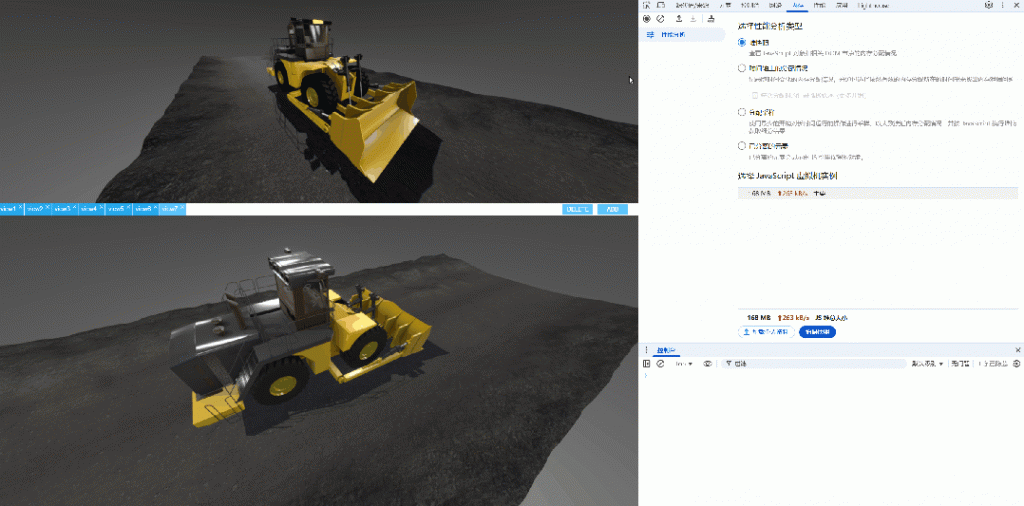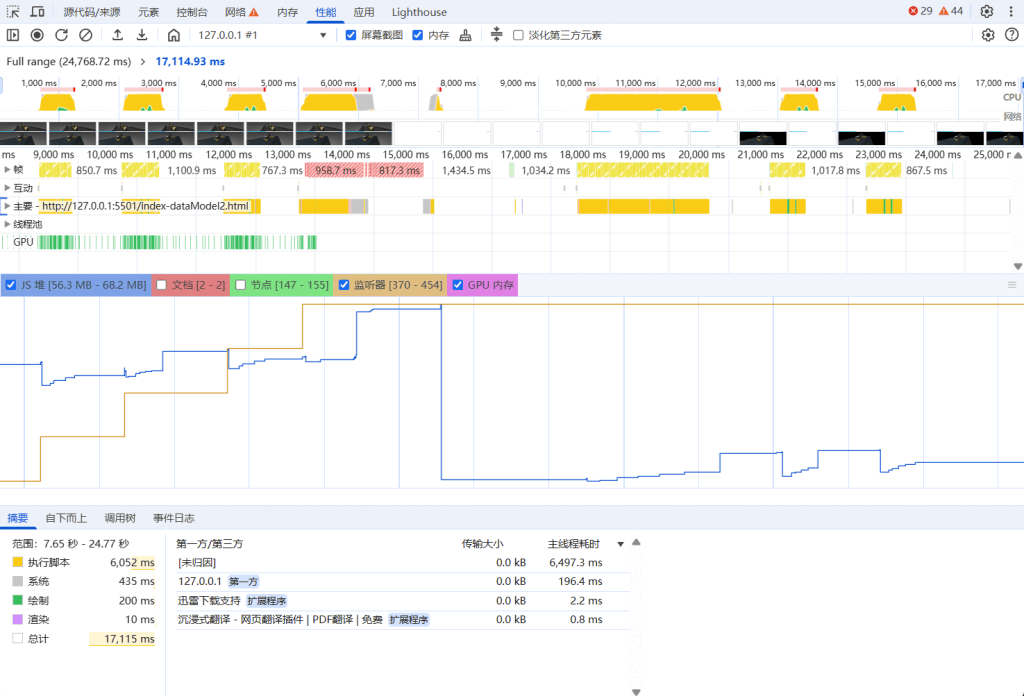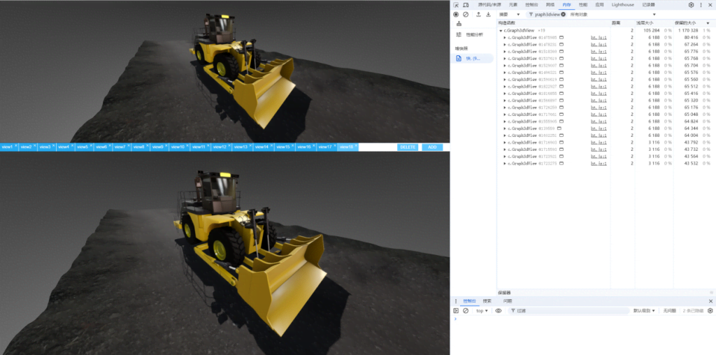 第二次实验 我们将所有的 Graph3dView 都绑定到一个 window.dataModel 上。具体可以参考下图: 同实验一,我们也通过按钮创建多个视图,在告警后删除最后一个视图。可以发现,当删除了最后一个 Graph3dView ,第一个场景也并没有恢复。 我们从 Performance 面板中观察到整个过程: