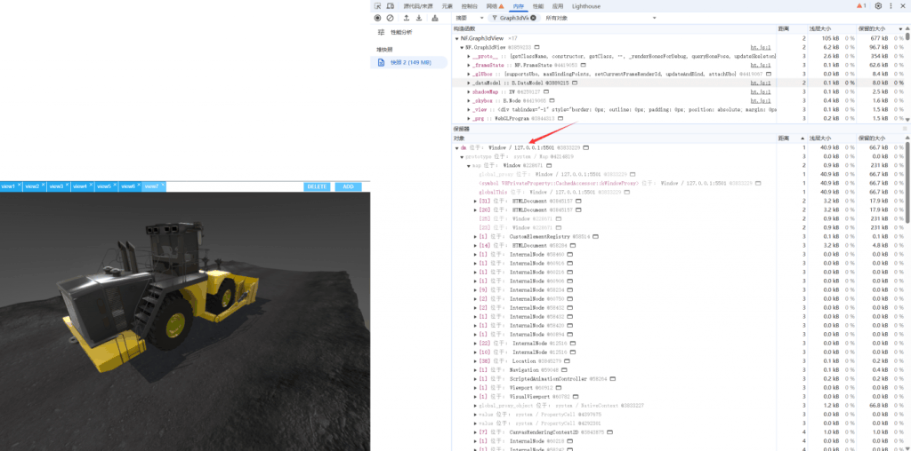 照第一组实验的结论来说,只要数据模型还在,视图应当“复活”,但是视图并没有“复活”。 为什么会出现上述两种情况?这是因为第二次,并没有正确地将 Graph3dView 清除。可以看一下两次实验系统的内存对象引用关系。 第一次 第二次 第一次实验,页面上有 19 个 Graph3dView,在内存中看到有 19 个 Graph3dView 对象,而第二次页面上仅有 7 个 Graph3dView,但是内存中有 17 个 Graph3dView 对象。这就说明了第二次的 Graph3dView 并没有被正确垃圾回收,这也就导致了即使移除了一个 Graph3dView,第一个场景也并不会恢复。打开其中一个 Graph3dView 可以看到,Graph3dView 与 window.dataModel 存在引用关系导致的。 解决方案 从上述的对照试验中,可以看出使用全局变量存储视图实例是导致内存泄漏的主要原因。当多个 Graph3dView 共享同一个全局 dataModel 时,即使删除视图,由于全局引用依然存在,这些视图无法被垃圾回收。 针对于内存泄漏可以通过以下几个方案解决: 1、避免全局变量引用 该方案从业务架构层面上解决内存泄漏问题,可采用以下实现方式: