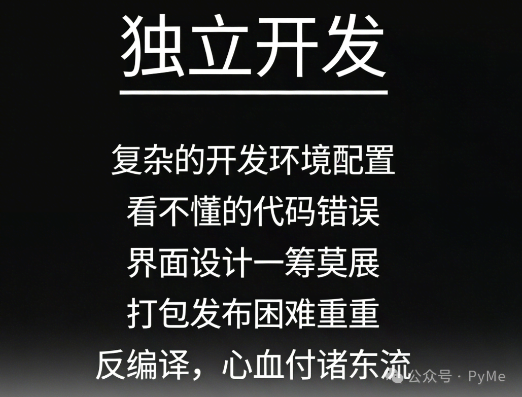然而,当你满怀热情打开电脑,准备大展身手时,现实往往给你当头一喝:复杂的开发环境配置、看不懂的代码错误、界面设计一筹莫展、打包发布困难重重……更令人沮丧的是,好不容易开发出的软件,竟可能被人轻易反编译,心血付诸东流。 “要是能用Python开发软件,该多好啊!”——数百万开发者的共同心声在众多编程语言中,Python无疑是最亲民的选择。它语法简洁如英语,学习曲线平缓;功能强大到从数据分析到人工智能无所不能;社区活跃,海量开源库任君取用;更重要的是,它与当前最火的AI技术天然契合,让“AI辅助编程”从概念变为日常。 但就是这样一门近乎完美的语言,却在应用软件开发领域存在几个“先天不足”,让无数开发者又爱又恨: 痛点一:界面开发“老大难”