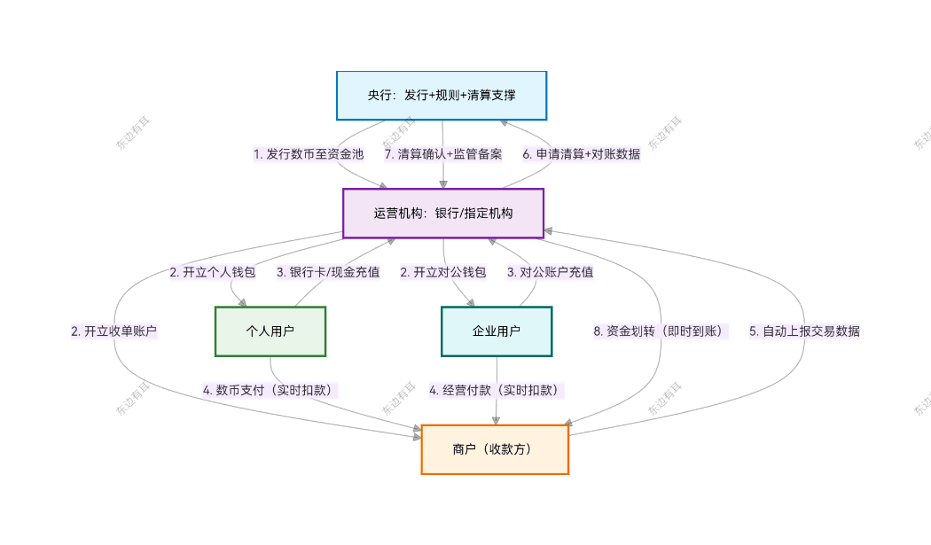 关键动作:运营机构收到央行清算确认后,即时将数币从对应资金池划转至商户收单账户。