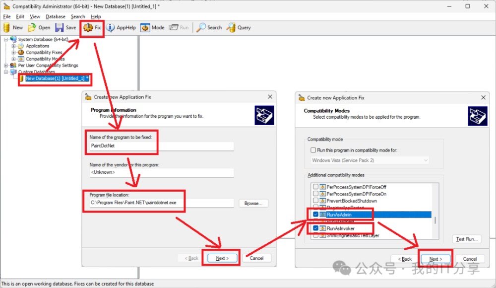 打开64位的ACT,按下图步骤操作。点一下左边列表的new database,然后点上面的Fix按钮,输入要被提权的软件的名字,然后选择这个软件的执行文件,Next,勾选RunAsAdmin和RunAsInvoker,然后一直Next直到Done完成。