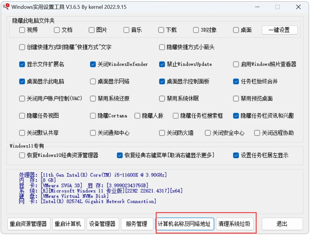 还可以一键清理临时文件,修改计算机名、地址等信息等。