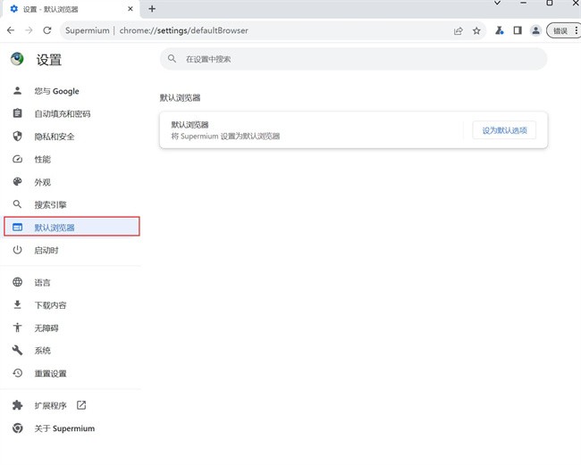注:Win7系统使用Supermium建议打上KB2670838补丁或者强制安装IE11,不然在浏览一些网页时会出现有的图标无法显示的问题。(WinXP系统没有此问题) 【Win10设置supermium为默认浏览器】: 1、在supermium文件夹下双击“chrome.exe”程序运行,在地址栏输入“chrome://settings”回车(或者点地址栏右边的“三个点→设置”)。 2、设置页面往下拉,在“默认浏览器”右边点“设为默认选项”按钮。 3、自动打开了“Win10设置→应用→默认应用”之后,点“Web浏览器”下的图标,选择“Supermium”图标,完成。 【Win11设置supermium为默认浏览器】: 1、在supermium文件夹下双击“chrome.exe”程序运行,在地址栏输入“chrome://settings”回车(或者点地址栏右边的“三个点→设置”)。 2、设置页面往下拉,在“默认浏览器”右边点“设为默认选项”按钮。