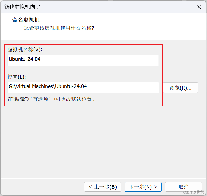 输入「虚拟机名称」(如 Ubuntu-24.04)→ 选择存储位置(非系统盘,如 G:\Virtual Machines)→ 下一步;