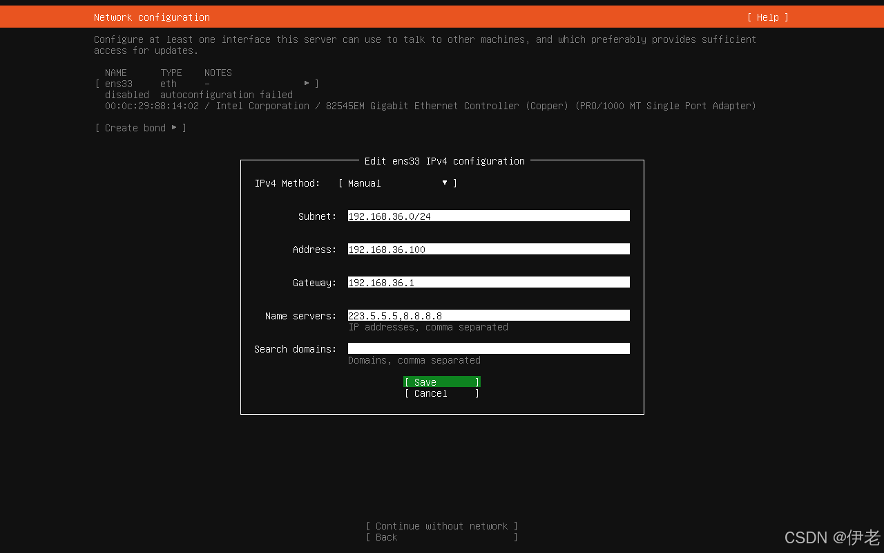 系统自动识别 ens33 接口,默认 DHCP 获取 IP,点击「Edit IPv4」→「Manual」→ 回车 → IP信息配置 → 「Save」→ 回车