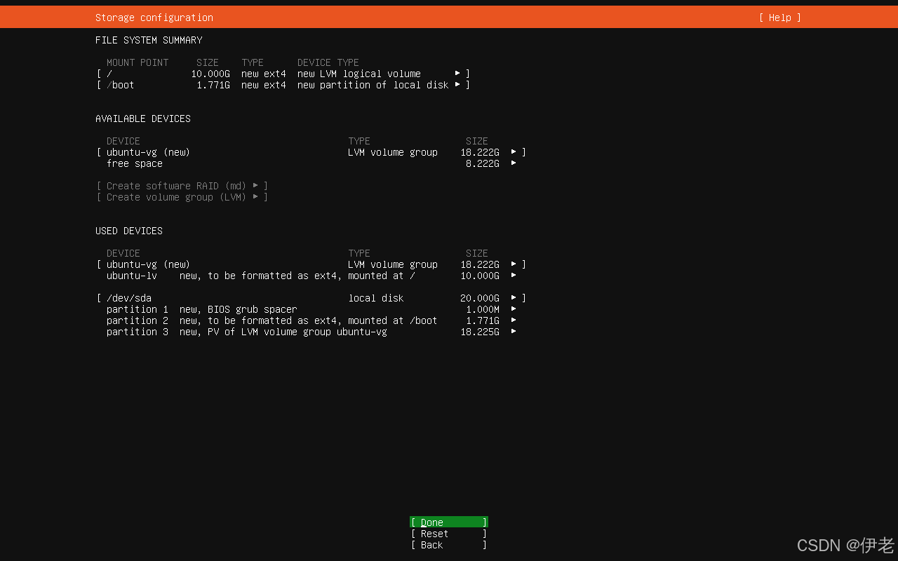 由于分配磁盘也就20G,选择默认分配 「Done」→ 回车;