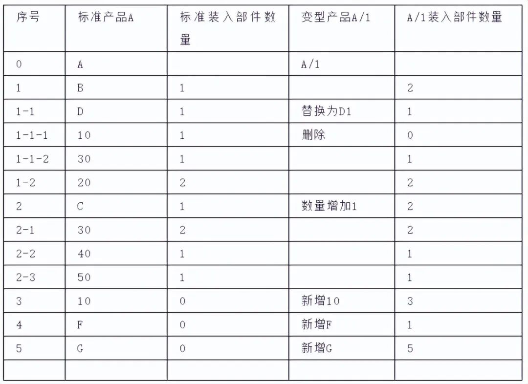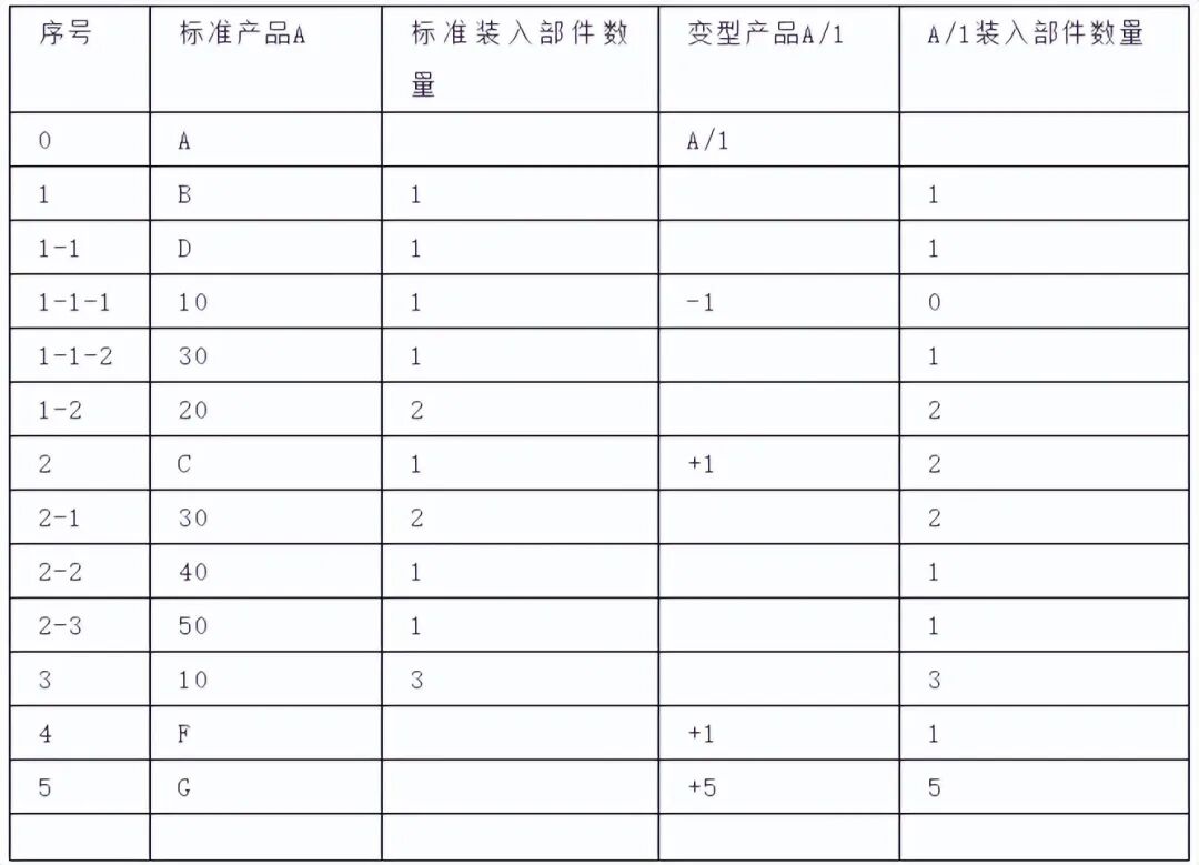 这种BOM有时又被为”比较式”或”异同式”BOM。它以标准产品为基准,并规定还可以增加哪些零件或去掉哪些零件。一个特定的产品就被描述为标准产品加上或减去某些零件。下表说明专用产品A/1是在标准产品A上增加零件F和G,同时增加部件C数量到2个,并去掉零件1-1-1制成。这种方法能有效地描述不同产品之间的差异,但不能用于市场预测,也不太适用于MRP。