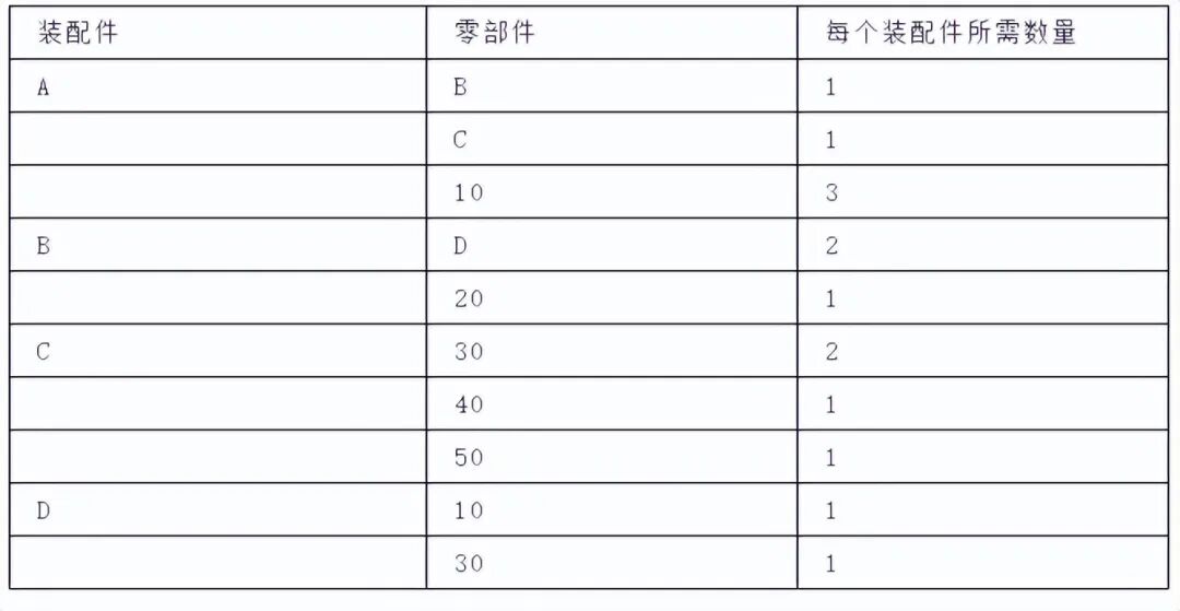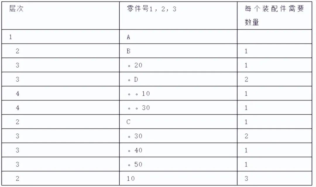 3、BOM中的零件,部件的层次关系一定要反映实际装配过程,在实际装配中,有时不一定把某些零件装配成某个有名称的组件,或者由于工艺上的考虑需要将某些零件归在一起加工(例如箱子与箱盖)。形成临时组件,但这些组件在产品的零件明细表和装配图上并没有反映出来,但必须在计划管理中反映出来,这就需要在BOM中设置一种物理上并不存在的项目,通常称为”虚单”或”虚拟件”,其目的是简化MRP的编程过程和减少零件之间的影响。
