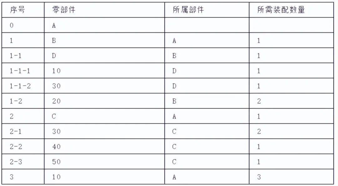 缩行跟踪的格式指出了某零件在所有高层物料中的使用情况。它可查找直接或间接地使用某零件的所有高层物料,采用这种格式很有价值。现以下表表示: