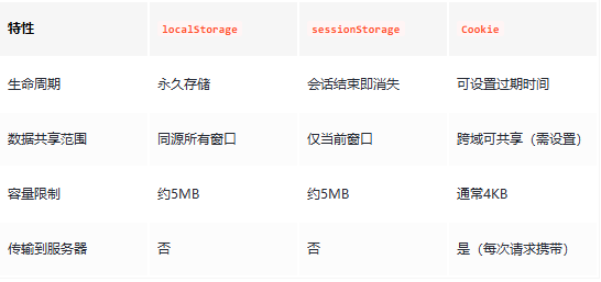 • 避免存储敏感信息(如密码、令牌),因数据可被 JavaScript 直接读取。