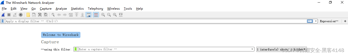 打开 Wireshark:由于笔记本连接的是 WIFI,因此点击 WLAN。