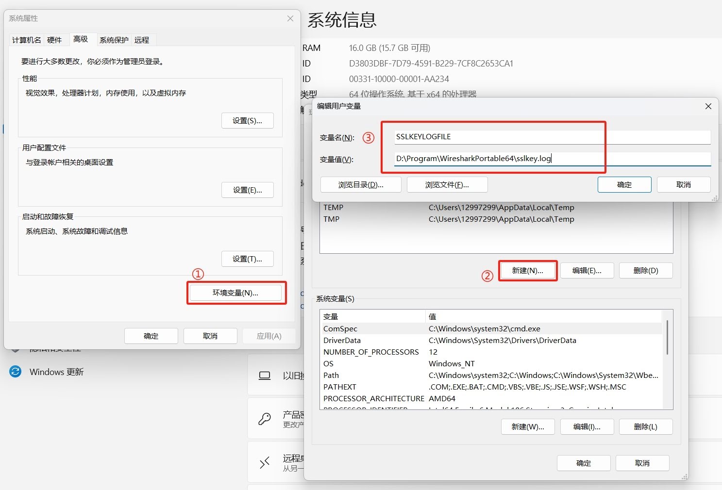 配置环境变量:设置环境变量 SSLKEYLOGFILE 为 C:\Users\Sun\sslkey.log。