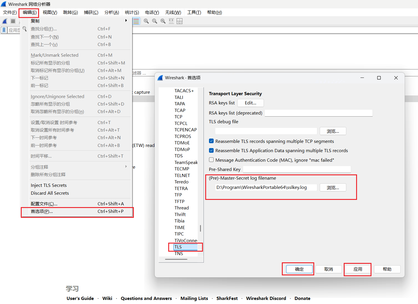 配置 Wireshark:进入 Edit → Preferences → Protocols → TLS,在 “(Pre)-Master-Secret log filename” 中填入 sslkey.log 的完整路径。