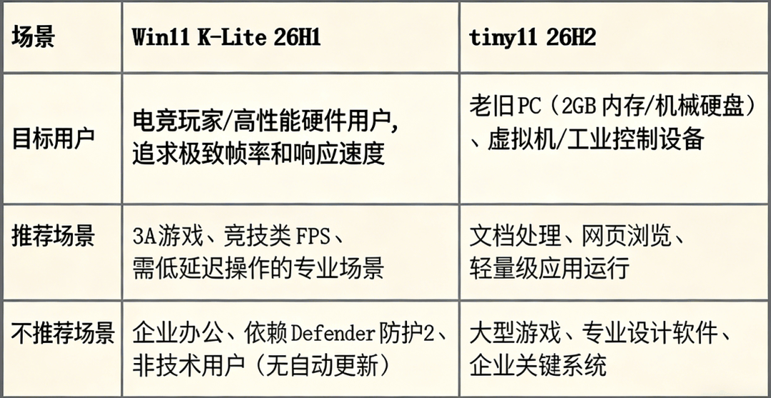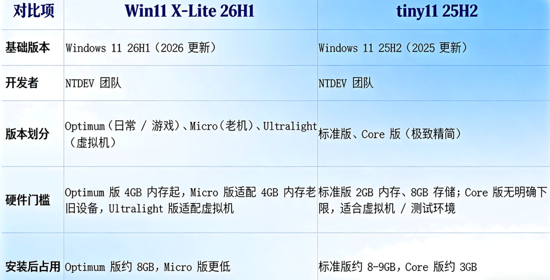 Win11 X-Lite 26H1 与Tiny11 25H2精简版系统谁好用?在如今的数码圈,“轻量化”早已成为众多用户的核心诉求。无论是希望老电脑重获新生的普通用户,还是追求极致游戏性能的硬核玩家,都对原版Windows系统中冗余的预装组件、后台进程感到困扰,而第三方精简版系统的出现,恰好精准击中了这一痛点。近期,Win11 X-Lite 26H1 与 Tiny11 25H2 两款第三方精简版Windows系统更是强势出圈,成为大家热议的焦点——前者以游戏性能优化为核心卖点,宣称能大幅提升帧率、缩短启动时间;后者则凭借亲民的硬件门槛和接近原版的稳定性,收获了大批老设备用户的青睐。 随着两款系统的下载量持续攀升,关于它们的讨论也愈发激烈:有人说Win11 X-Lite 26H1的极致精简让游戏体验翻倍,也有人认为Tiny11 25H2的兼容性更适合日常使用;有人纠结于两者的安全风险差异,也有人关心不同配置设备下的适配表现。那么,这两款火爆的精简版系统到底哪个更值得选?它们在系统占用、性能表现、兼容性、安全性等关键维度上又有怎样的差异?今天,我们就带着这些疑问,为大家带来两者的详细对比,帮你根据自身需求做出最合适的选择。 ![]() Win11 X-Lite 26H1 与 Tiny11 25H2介绍 1、Win11 X-Lite 26H1介绍: Windows X-Lite 是由 NTDEV 团队开发的第三方定制精简版 Windows 系统,主打低资源占用、游戏性能优化与老旧设备适配,基于 Windows 10/11 官方核心深度精简,非微软官方发行Windows X-Lite。 Windows X-Lite团队发布基于Windows 11 26H1的轻量化定制系统,删减非必要组件并优化设置,显著降低内存与磁盘占用。Optimum版面向日常场景,兼顾性能与兼容;Micro及Ultralight版进一步精简服务,仅保留核心,适配旧PC与虚拟机,但删减幅度大,不推荐主力使用。团队宣称镜像“100%安全干净”,因其属第三方修改,安装风险需用户自担。 版本化分: 1、Optimum版本(日常 / 兼容性): 保留核心功能与兼容性,仅精简冗余组件,既能满足3A游戏高性能需求,又能流畅应对办公、直播等日常场景,是兼顾实用与性能的“万金油”。 2、Micro(旧机): 进一步删减非必要系统服务,仅保留最核心的运行模块,适合4GB内存、512GB SSD的老旧设备,最大化释放硬件潜力,让五年前的旧PC重新焕发战斗力。 3、Ultralight( 虚拟机): 极致精简所有非必需功能,仅维持基础系统框架,资源占用最低,专为虚拟机测试、低配主机专用游戏场景设计,不建议作为日常主力系统。 https://windowsxlite.com/downloads/ 网盘分流下载:https://pan.baidu.com/s/1paFkoNAVampk2DHysQ_TCg?pwd=if2q 2、Tiny11 25H2介绍: Tiny11 25H2 是由开发者 NTDEV 基于 Windows 11 25H2 官方镜像打造的第三方精简系统,2025 年 10 月发布,核心优势是突破硬件限制、大幅精简冗余、支持本地账户,分标准版与 Core 版,适配 x64 和 ARM64 设备,适合老电脑与轻量场景。 熟悉 Tiny11 的都知道,这是基于原版 Win 11 精简定制的一个更轻量、纯情、更省心的系统,曾受到无数用户青睐。而 Tiny11 25H2 则基于最新原版 Win 11 25H2 镜像打造。它直接砍掉了大量动不动就跑后台、占用资源、我们可能一辈子都用不上的功能和组件、一堆预装 App 以及各种奇奇怪怪的服务。 版本化分: 1、标准版(标准版):老电脑日常使用、轻度办公、娱乐 约8-10GB,核心移除Copilot、新 Outlook、Teams、Edge、Xbox 等预装应用,禁用部分遥测,保留 Windows Update,可获取累积补丁,部分功能更新可能失败。 2、Core版(极限精简版):虚拟机、离线设备、测试环境,不建议主力机使用 约 3-5GB,在标准版基础上进一步移除 Windows Update、WinSxS、Windows Defender(默认禁用)、WinRE 等,完全无更新能力,不支持系统更新与恢复。 夸克网盘分流下载:https://pan.quark.cn/s/40b67b4a3ece 百度网盘分流下载:https://pan.baidu.com/s/1-nZ0gUEPv1l5YqqS8-9wDw?pwd=hbnf 提取码: hbnf Win11 X-Lite 26H1 VS Tiny11 25H2从多个角度终极对比 Win11 X-Lite 26H1 是基于 Win11 26H1 打造的游戏向精简系统,资源占用更低、游戏优化更强,有多个版本可选;tiny11 25H2 基于 Win11 25H2,主打轻量化与基础兼容性,更新与安全机制保留更完整,适合老设备日常使用。 1、核心基础信息: Win11 X-Lite 26H1:Win11 X-Lite 26H1是由NTDEV团队2026年更新,版本分为:Optimum、Micro、Ultralight三个版本。 Tiny11 25H2:是由NTDEV团队2025年更新,版本分为标准版和Core两个版本。 2、功能精简对比: Win11 X-Lite 26H1是以深度精简系统组件、彻底关闭后台服务为核心手段,专为游戏玩家及高性能场景设计的第三方优化系统,专为与所有应用程序和游戏配合使用而设计,适用于所有电脑。无论新旧、配置高低、台式机还是笔记本电脑。 绕过 TPM、安全启动、内存、CPU 和存储检查,绕过 Microsoft 在安装/设置过程中强制创建帐户。 Tiny11 25H2主要亮点就是精简,开发者将系统里的各种冗余软件删除提高系统的运行效率,并且不需要满足 Windows 11 硬件要求(绕过 TPM 强制要求)和微软账号,这对于老旧 PC 来说也是个福音。 Win11 X-Lite 26H1: •游戏优化:内置智能资源分配引擎,优先分配 CPU 算力给前台游戏,暂停后台服务;预装 DirectX 全版本、VC++ 等运行库,解决游戏组件缺失问题;优化内存压缩和 DirectStorage 解压效率,缩短关卡加载时间。 •精简内容:砍掉 Cortana、Microsoft Store、Windows Defender(可选保留),禁用遥测、广告推送等,后台进程仅 49-62 个,空闲内存占用低至 1.1GB。 •账户与部署:支持离线创建本地账户,跳过微软账号强制登录,全程无需联网,3 分钟完成部署。 Tiny11 25H2