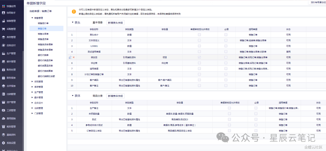 [点晴模切ERP]金蝶云·星辰单据新增字段常见问题