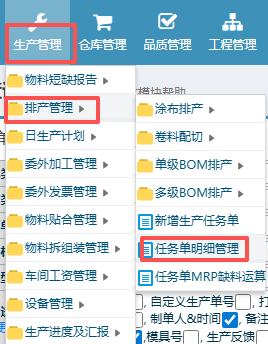 1. 在ERP系统内找到“生产管理”》“排产管理”》“任务单明细管理”,点击进入。