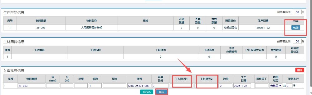 3.接着会出现弹窗,在弹窗内下方找到“生产产品信息”,点击“包装”,下方的“入库批号信息”会显示对应的物料。然后填写对应的主材批号(有2个就填写2个)