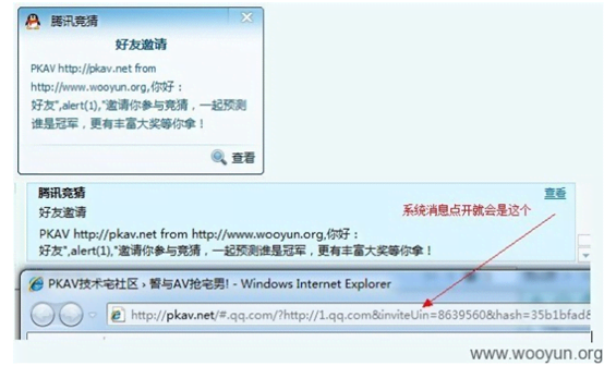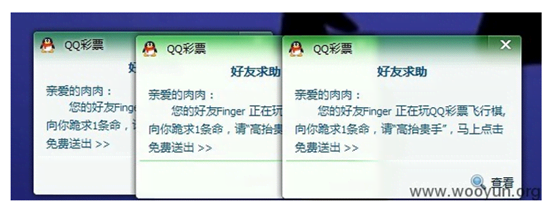 漏洞链接:网络尖刀安全团队研究发现QQ客户端存储XSS,可劫持用户! 漏洞链接:腾讯QQ群持久xss攻击(可执行js窃取cookie挂马等已经有人利用) 附加说明:两个链接为同一漏洞,前者先向TSRC报告,后漏洞流出,被发至乌云平台。 场景6: QQ右下角弹窗篇之消息轰炸 如果有一天,你的QQ一直弹出下来这样的消息,会不会有一丝丝蛋疼(女性除外)。