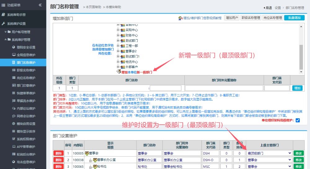 :点晴MIS系统在设置部门时如何直接增加最顶级部门?![]() 在如下位置:设置-》系统维护设置-》系统维护管理-》部门名称维护 ![]() 新增时和后续维护时,都可以设置此部门为一级部门(最顶级部门)。 注意: 设置部门必须从最顶级部门开始,然后逐级往下添加部门,不允许从中间或最低级部门开始随时设置部门。 该文章在 2026/1/24 11:01:40 编辑过 |
