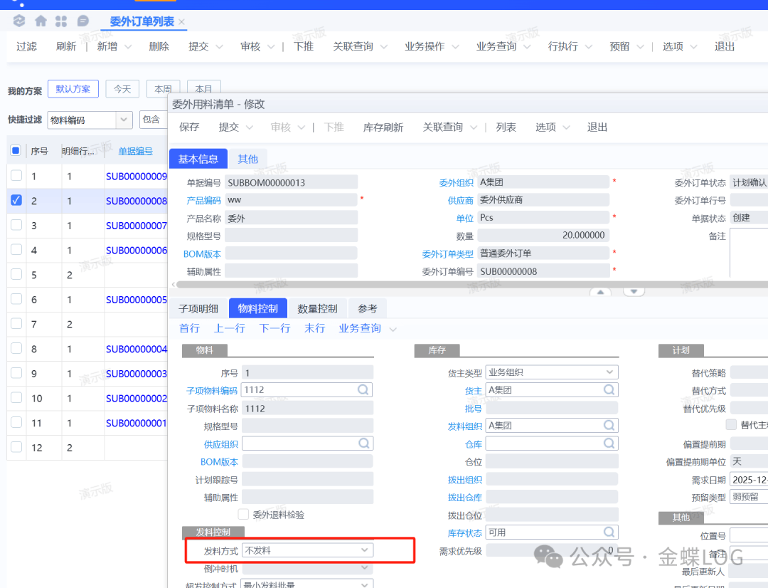 方式二:重新新增一个新的委外订单,将用料清单材料改成【不发料】。