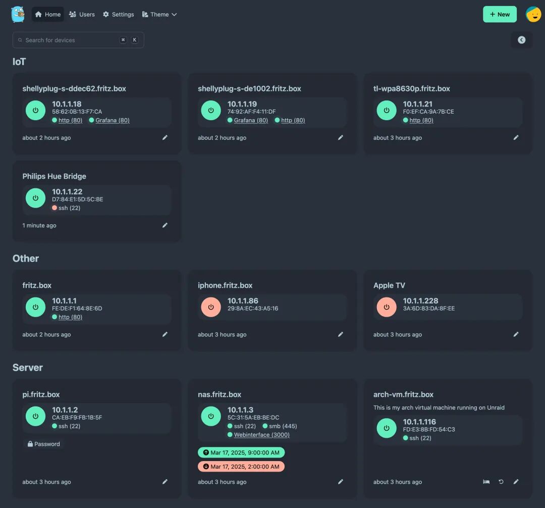 它能让我们直接在浏览器里,给局域网内的设备发送“起床气”,一键远程开机。 这款工具最大的亮点,就是把原本复杂难懂的技术,变成了一个简单直观的网页仪表盘。 只要在服务器或软路由上部署好,我们就能在手机或笔记本上随时访问。 界面非常清爽,所有设备一目了然。 看到哪个设备是灰色的“离线”状态,点一下旁边的电源按钮,它就会立马被唤醒。