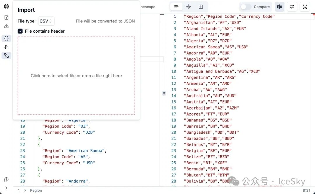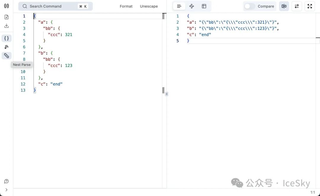 比较:支持结构化差异对比和纯文本对比,方便快速发现两个JSON文件的异同。