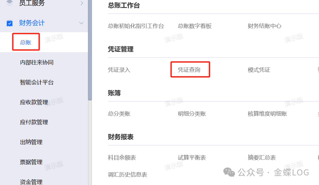 ③智能会计平台查看凭证路径:财务会计-智能会计平台-总账凭证查询 这里查询出来的凭证就是所有模块的数据,跟下面第④个总账路径查出来的数据是一样,只是这里多了一个【业务凭证的查询】。