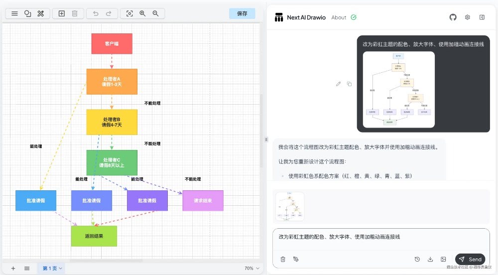 然后你可以利用 Draw.io 自身强大的绘图能力手动修改任意元素、或者是改变风格样式。 也可以通过 AI 对话让它帮你修改,比如改成动画连接线,逼格一下子就上来了。