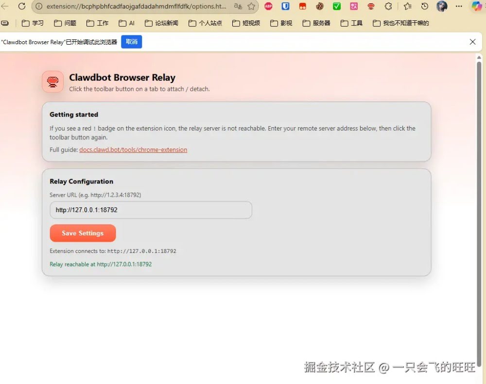 这两天看公众号都是安装教程,也没看到其他使用上的问题, 我来分享一下我的一些使用经验吧! 这几天晚上经常用OpenClaw 帮我操作点东西,结果发现浏览器又连不上了。重启 Gateway 后,我又得打开 Chrome,手动点击那个 Browser Relay 插件的图标, 这大冬天的,谁愿意起来碰电脑啊, 这让我苦恼不已! 简单介绍OpenClaw(前身为 Clawdbot/Moltbot)是一款强大的 AI 助手框架,其浏览器自动化功能让 AI 能够"看见"并"操作"网页。 本文将深入介绍 OpenClaw 的远程浏览器功能——特别是 Chrome Extension Relay 模式,以及我在使用过程中遇到的问题和解决方案。至于为嘛不用内置的浏览器功能,因为启动一个chrome我的小服务器就快顶不住了! 什么是 Browser Relay?OpenClaw 提供了两种浏览器控制模式: