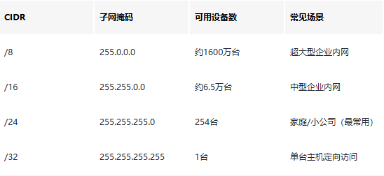 CIDR用 /数字 表示子网掩码中连续1的位数,替代繁琐的点分格式,日常开发高频使用: