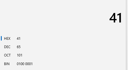----得到UTF-8编码:01000001 - 二进制转换成十六进制