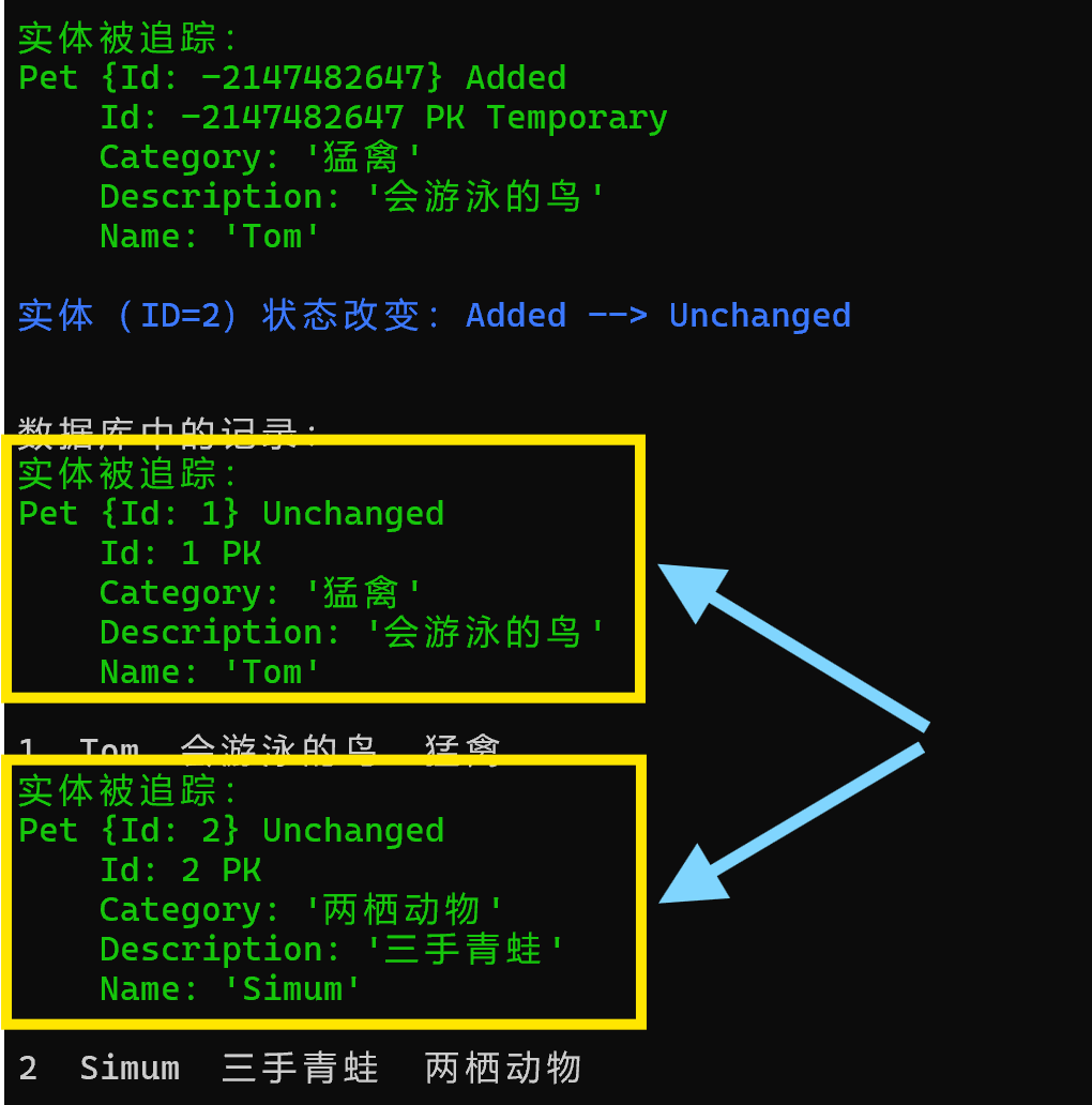 Name: 'Jack'这样做可能会导致逻辑错误,除非你有特殊用途,比如这样用。 using var context = new TestDbContext(); context.Database.EnsureDeleted(); context.Database.EnsureCreated(); // 处理事件 context.ChangeTracker.Tracked += (_, e) => { var backupcolor = Console.ForegroundColor; Console.ForegroundColor = ConsoleColor.Green; Console.WriteLine($"实体被追踪:\n{e.Entry.DebugView.LongView}\n"); Console.ForegroundColor = backupcolor; }; context.ChangeTracker.StateChanged += (_, e) => { var bkColor = Console.ForegroundColor; Console.ForegroundColor = ConsoleColor.Blue; Console.WriteLine($"实体(ID={e.Entry.Property(nameof(Pet.Id)).CurrentValue})状态改变:{e.OldState} --> {e.NewState}\n"); Console.ForegroundColor = bkColor; }; // 新实体 Pet p = new Pet { Name = "Tom", Description = "会游泳的鸟", Category = "猛禽" }; context.Add(p); // 保存,但状态不改变 context.SaveChanges(false); // 因为是 Added 状态,所以还可以继续insert p.Name = "Simum"; p.Description = "三手青蛙"; p.Category = "两栖动物"; // 保存,状态改变 context.SaveChanges(); // 把它们查询出来看看 var set = context.Set<Pet>(); Console.WriteLine("\n数据库中的记录:"); foreach(var pp in set) { Console.WriteLine($"{pp.Id} {pp.Name} {pp.Description} {pp.Category}"); } 上面代码中,侦听了两个事件:Tracked——当 EF Core 开始跟踪某个实体时发生;当有实体的状态改变之后发生。其实还有一个 StateChanging 事件,是在实体状态即将改变时发生。总结来说就是:状态改变之前发生 StateChanging 事件,改变之后发生 StateChanged 事件。要注意,StateChanged 和 StateChanging 事件在 EF Core 首次追踪实体时不会引发。比如,刚开始追踪时状态为 Unchanged,不会引发事件,而之后状态变为 Added,就会引发事件(最开始那个状态不会触发事件)。 上面代码处理 Tracked 事件,当开始追踪某实体时,打印一下调试信息,记录某状态;处理 StateChanged 事件,在开始追踪状态后,状态发生改变之后打印变化前后的状态。 代码运行结果如下: