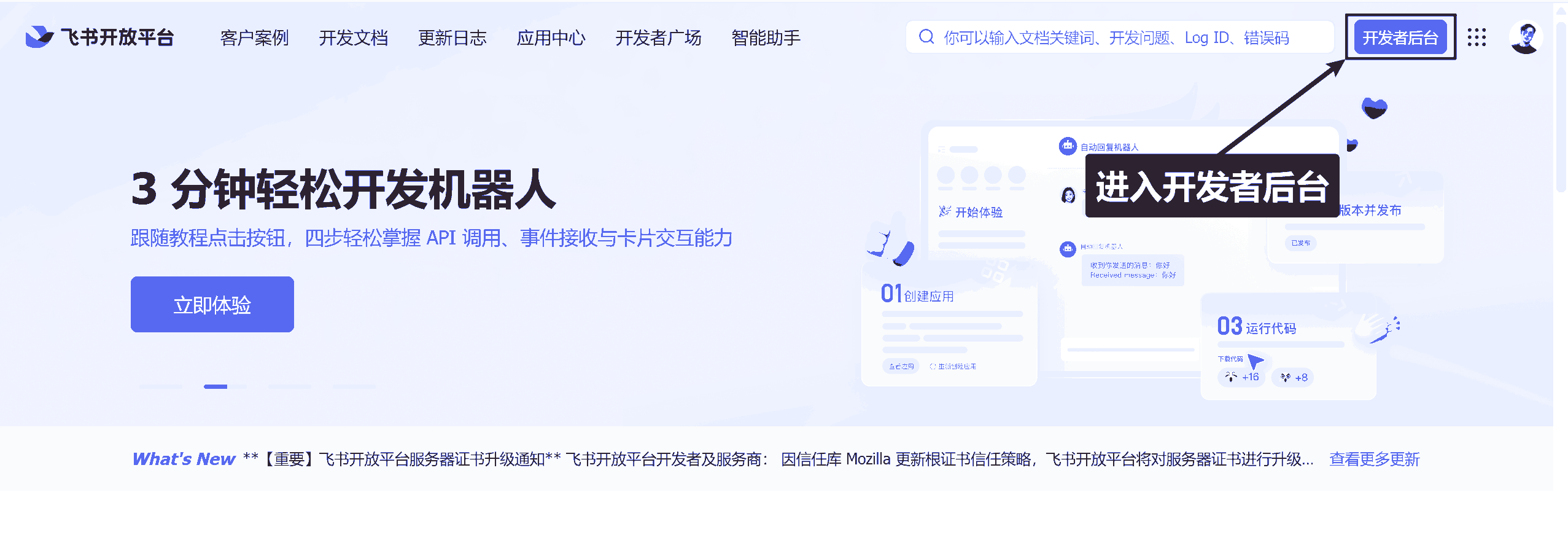 五、接入飞书机器人我们需要先到飞书平台创建自己的机器人来接入OpenClaw: 一)来到飞书开发者后台飞书开放平台地址:https://open.feishu.cn