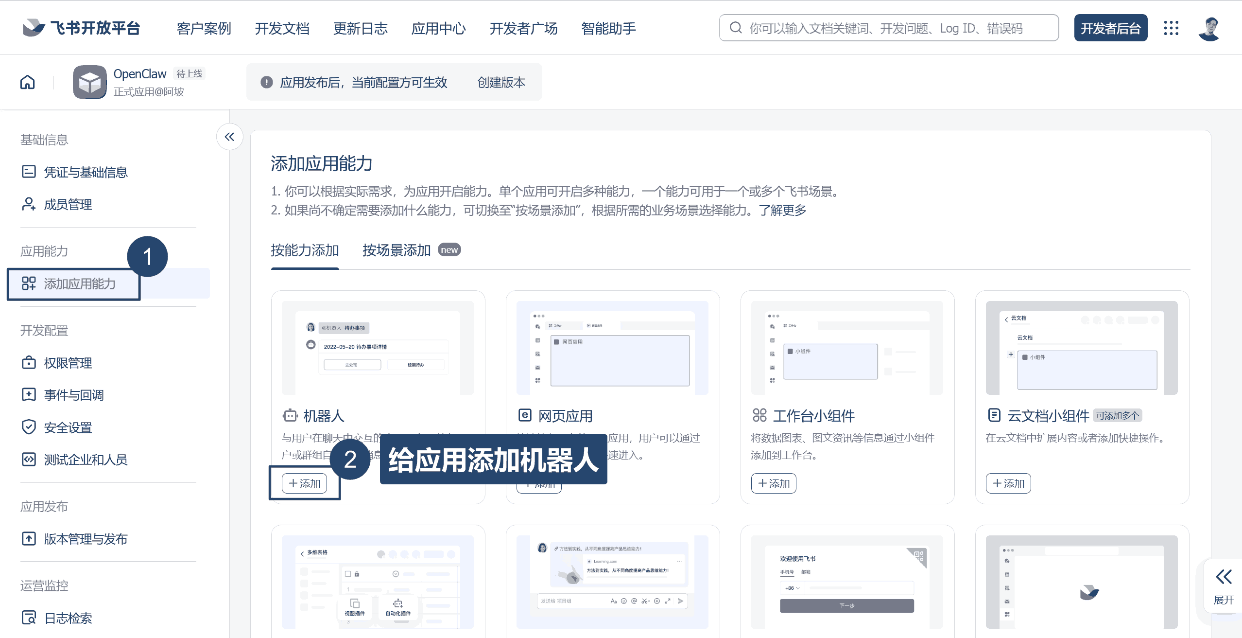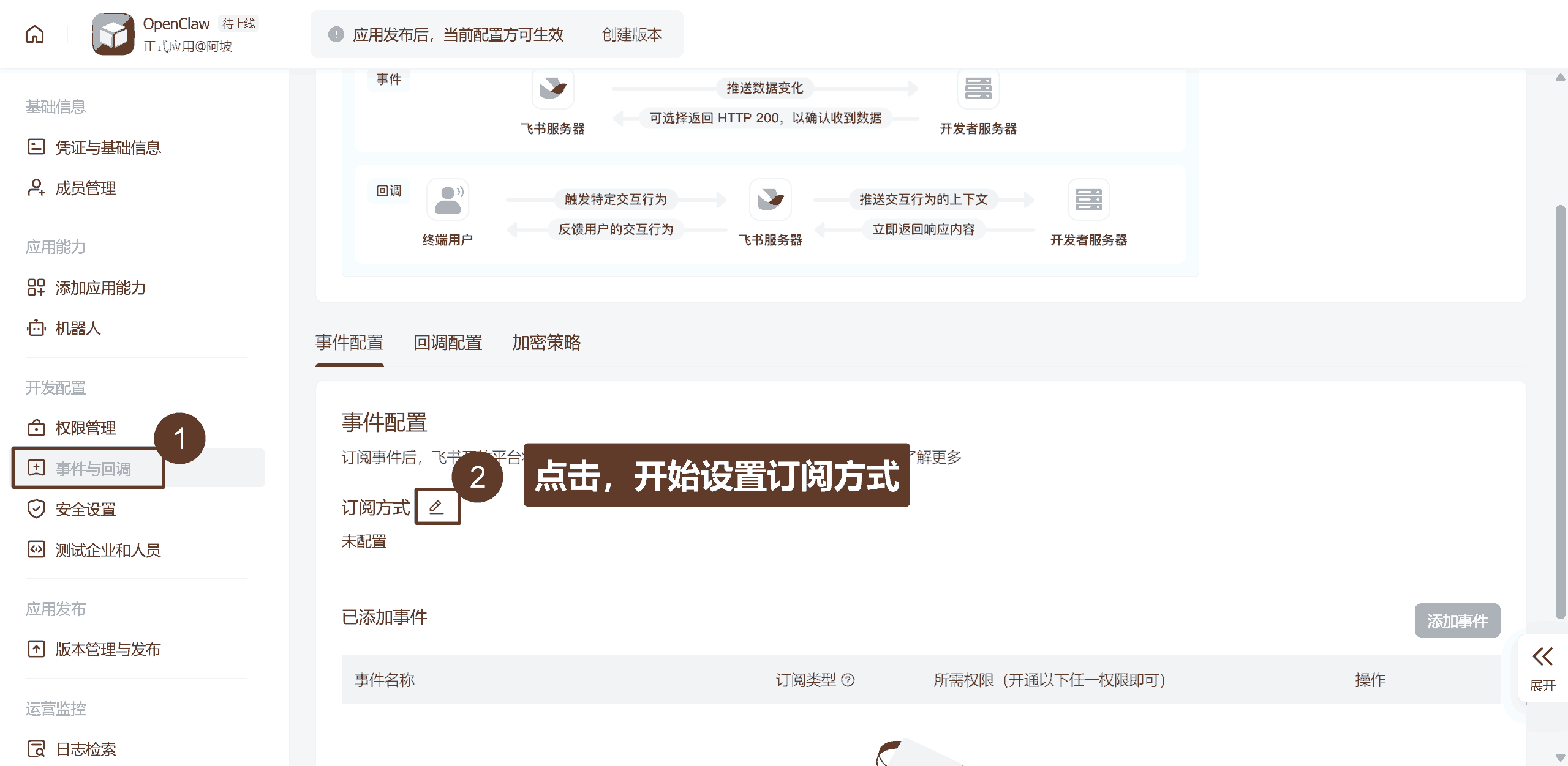 可以看到添加事件按钮由原来的灰色不可点击变为可点击: 添加接收消息事件: 给应用开通获取通讯录基本信息的权限: 重新发布版本: 跟前面的步骤一样,发布为在线应用即可。 现在可以在 飞书中与 AI 助手对话了! 八)在飞书中与OpenClaw对话来到飞书客户端或者手机飞书app上:
