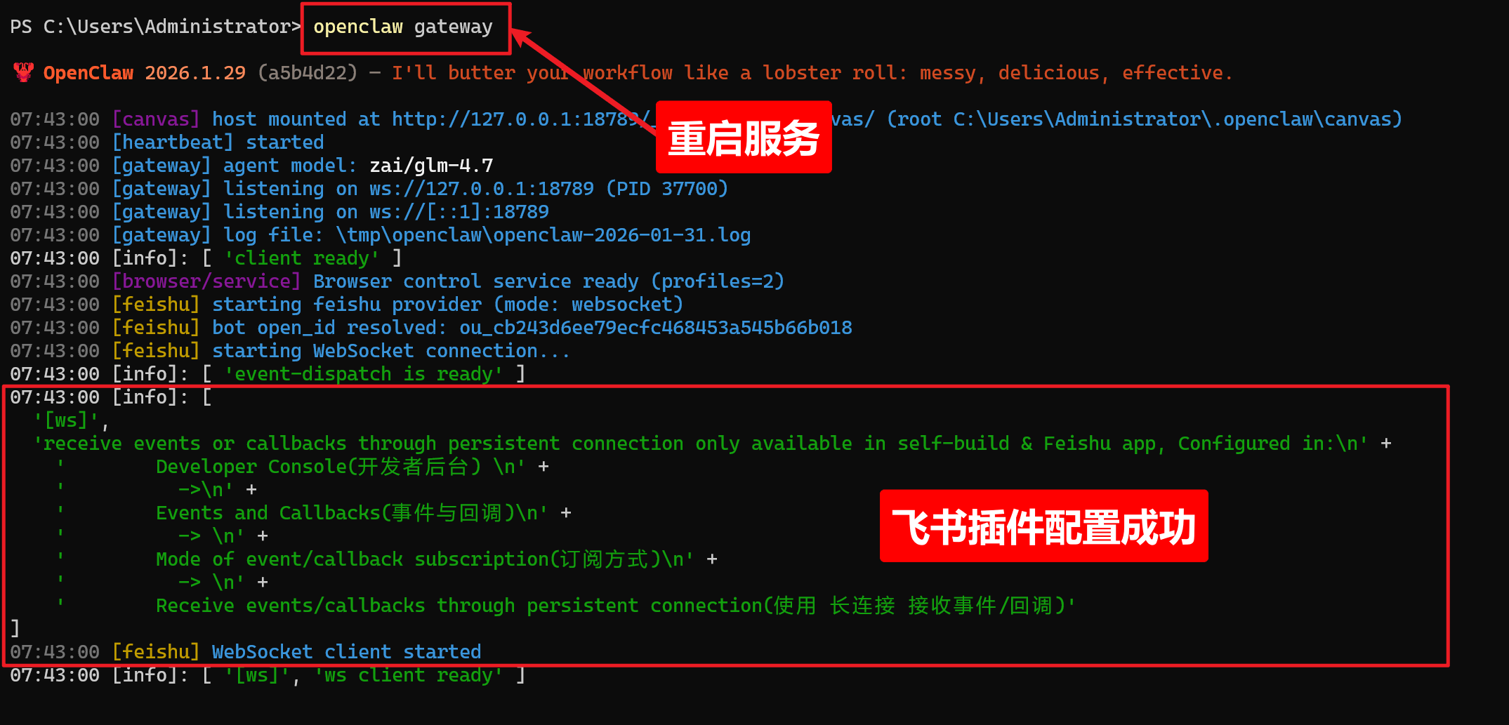 八)安装飞书插件打开powershell,输入以下命令,安装飞书插件: 安装成功后,再打开一个新的命令窗口,开始配置飞书插件: 输入命令:
