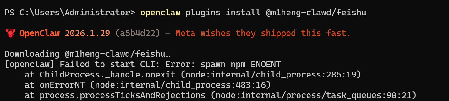 八、常见问题解答Q1: 安装飞书插件提示:spawn npm ENOENT
