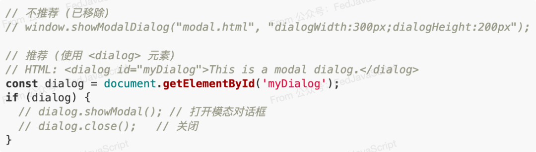 showModalDialog() 用于打开一个模态对话框,它会阻塞父窗口的JavaScript执行,直到对话框关闭。这种阻塞行为与现代Web应用的异步、非阻塞理念相悖,用户体验差,且存在安全风险。主流浏览器已将其移除。