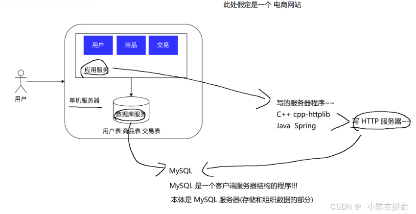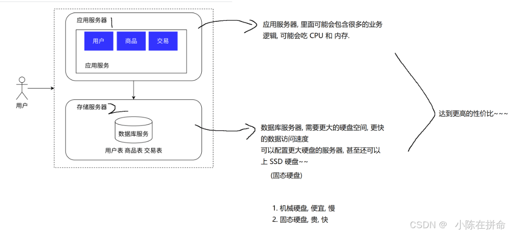 用户在浏览器中输⼊www.xxx.com,⾸先经过DNS服务将域名解析成IP地址10.102.41.1,随后浏览器访问该IP对应的应⽤服务。就是我们所写的服务器程序,然后这个服务器程序又作为mysql的客户端向mysql服务器发送读写请求。 单机程序中,其实也可以把数据库服务器也去掉,光一个应用服务器又复杂业务又负责数据存储,但是这样会比较麻烦 千万不要瞧不起单机架构!!因为绝大部分公司的产品都是单机架构的,因为计算机硬件发展速度很快,哪怕只有一台主机他的性能也是很高的,可以支持非常高的并发和非常大的数据存储 相关软件: Web服务器软件:Tomcat、Netty、Nginx、Apache等 数据库软件:MySQL、Oracle、PostgreSQL、SQL Server等 2.2 为什么需要分布式系统单机效率已经很高了,但是如果业务进一步增长,当用户量和数据都水涨船高,一台主机难以应付的时候,就又必要引入更多的主机、更多的硬件资源!! 1、一台主机的硬件资源是有上限的,包括但不限于以下操作 (1)CPU (2)内存 (3)硬盘 (4)网络 (5)…… 服务器每次收到一个请求,都是需要消耗上述的一些资源的,如果同一时刻处理的请求多了,可能就会导致某个硬件资源不够用了!!从而导致服务器处理请求的时间变长甚至是处理出错!! 2、如果我们遇到了这样服务器不够用的场景要如何处理呢?? (1)节流:软件上优化。对程序员要求高,比方通过性能测试查看是哪个环节出的问题再去对症下药(数据结构和算法) (2)开源:增加更多的硬件资源,但是一个主机上能够增加的硬件资源也是有限的,这取决于主板的扩展能力。 (3)引入多台主机:但并不是说买了新机器就可以解决问题了,也需要在软件上做出相应的调整和适配!! 引入多台主机,咱们得系统就可以被称为“分布式系统”了,但是这是万不得已的操作,因为这样系统的复杂程度会大大提高,且出现bug的概率也会更高!! 2.3 应用服务和数据库服务分离随着系统的上线,我们不出意外地获得了成功。市场上出现了⼀批忠实于我们的用户,使得系统 的访问量逐步上升,逐渐逼近了硬件资源的极限,同时团队也在此期间积累了对业务流程的⼀批经 验。⾯对当前的性能压⼒,我们需要未雨绸缪去进⾏系统重构、架构挑战,以提升系统的承载能力。 但由于预算仍然很紧张,我们选择了将应⽤和数据分离的做法,可以最小代价的提升系统的承载能力。
