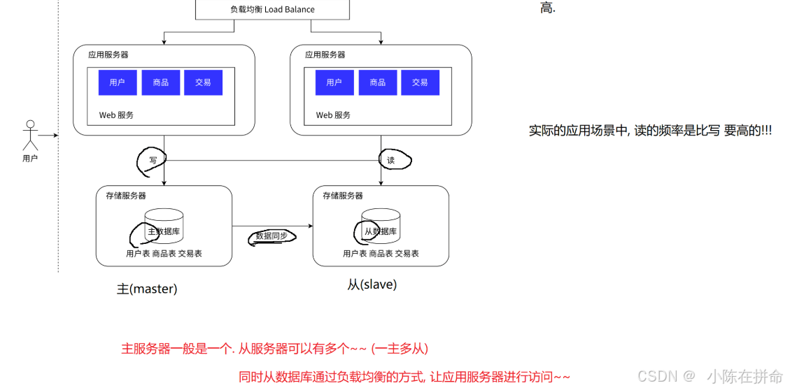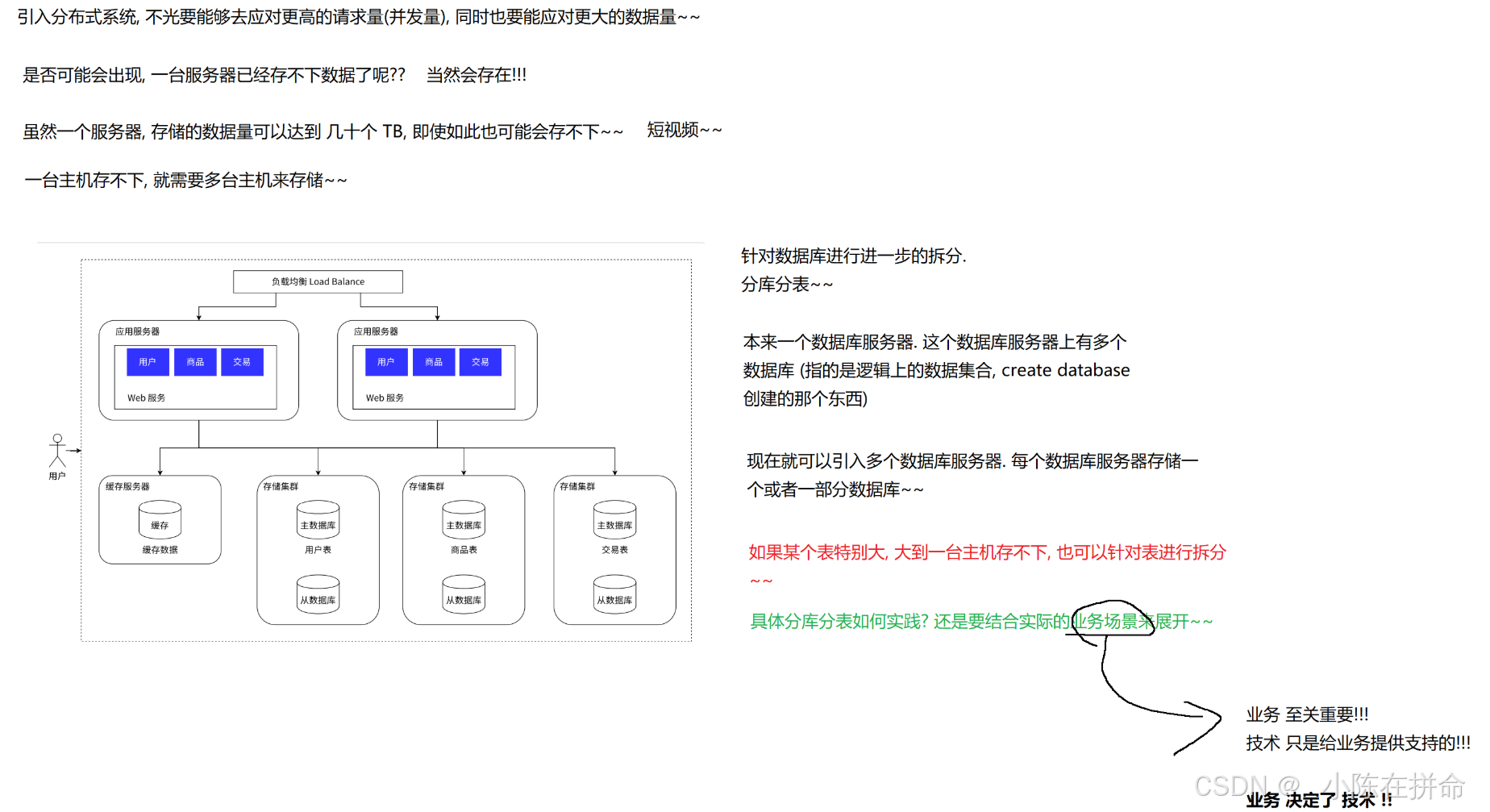 2.5 理解负载均衡负载均衡器就像一个组长一样,要负责把任务合理分发给组员 1、负载均衡器的流量调度算法也有很多种,这⾥简单介绍⼏种较为常⻅的 • Round-Robin 轮询算法。即⾮常公平地将请求依次分给不同的应⽤服务器。但是这样其实并不好,如果一个用户发送多个请求的话我们会希望尽可能让一个用户的请求都在一台机器上 • Weight-Round-Robin轮询算法。为不同的服务器(⽐如性能不同)赋予不同的权重(weight), 能者多劳。 • ⼀致哈希散列算法。通过计算用户的特征值(⽐如IP地址)得到哈希值,根据哈希结果做分发,优 点是确保来⾃相同用户的请求总是被分给指定的服务器。也就是我们平时遇到的专项客⼾经理服务。 具体这个算法怎么去设计,也是要结合实际的业务场景。 2、 负载均衡里能够承担这么多请求么?? 负载均衡器(负责分配工作)对于请求的承担能力要远超应用服务器(负责执行任务)的。如果真的扛不住了那就只能引入更多的负载均衡器了!(多个机房) 3、关于负载均衡的生活举例:1个班主任(应用服务器)可以跟进50个同学(请求),跟进他们的作业、日常需求。但是当学生越来越多的时候就需要有更多的班主任(引入更多应用服务器),但是班主任多的话也需要管理,因为比如有的班主任请假(应用服务器宕机),需要想办法把他的学生分担给其他班主任,所以设置1个年段长(负载均衡器),来给班主任分配学生(流量调度算法),而随着学生再更多,班主任和年级长也更多,这个时候就需要有更多的校区(增加负载均衡器),然后由校长(负载均衡器管理器)对各个校区做管理。 要注意的是,当人(机器)变多的时候,管理成本和出问题的概率也会变得很高!! 4、负载均衡软件:Nginx、HAProxy、LVS、F5等 2.6 读写分离/主从分离架构我们把用户的请求通过负载均衡分发到不同的应⽤服务器之后,可以并⾏处理了, 并且可以随着业务的增⻓,可以动态扩张服务器的数量来缓解压⼒。但是现在的架构⾥,无论扩展多少台服务器,这些请求最终都会从数据库读写数据,到⼀定程度之后,数据的压⼒成为系统承载能⼒的瓶颈点。我们可以像扩展应⽤服务器⼀样扩展数据库服务器么? 答案是否定的,因为数据库服务有其特殊性:如果将数据分散到各台服务器之后,数据的⼀致性将无法得到保障。所谓数据的⼀致性, 此处是指:针对同⼀个系统,无论何时何地,我们都应该看到⼀个始终维持统⼀的数据。想象⼀下, 银⾏管理的账户⾦额,如果收到⼀笔转账之后,⼀份数据库的数据修改了,但另外的数据库没有修改,则用户得到的存款⾦额将是错误的。 我们采⽤的解决办法是这样的,保留⼀个主要的数据库作为写⼊数据库,其他的数据库作为从属数据库。从库的所有数据全部来⾃主库的数据,经过同步后,从库可以维护着与主库⼀致的数据。然后为了分担数据库的压⼒,我们可以将写数据请求全部交给主库处理,但读请求分散到各个从库中。 由于⼤部分的系统中,读写请求都是不成⽐例的,例如100次读1次写,所以只要将读请求由各个从 库分担之后,数据库的压⼒就没有那么大了。当然这个过程不是无代价的,主库到从库的数据同步其实是有时间成本的,但这个问题我们暂时不做进⼀步探讨。